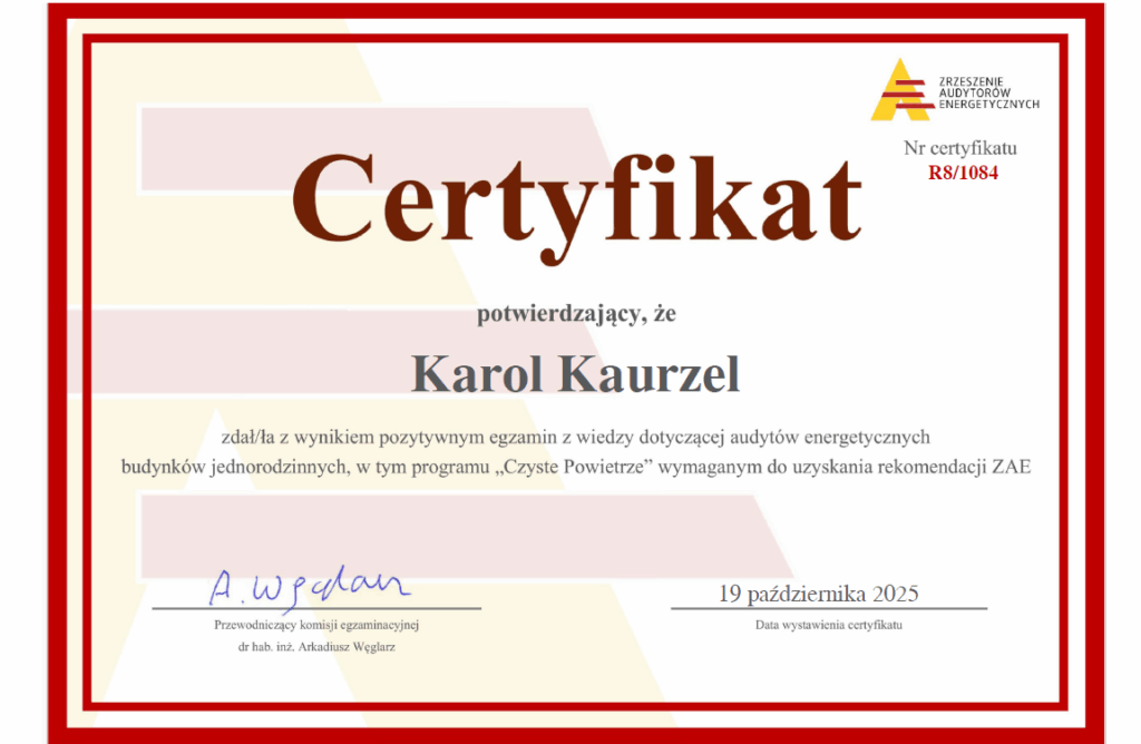 Posiadam gruntowną wiedzę w wykonywaniu takich opracowań. Już na etapie studiów interesowała mnie ta tematyka, przedmiotem mojej pracy inżynierskiej było zaprojektowanie budynku „pasywnego” z wykorzystaniem ówczesnych metod pozyskiwania energii odnawialnej na potrzeby jego ogrzania i przygotowania ciepłej wody użytkowej. W pracy magisterskiej natomiast już w korzystałem z zdobytej wiedzy przeprowadzając analizę możliwości obniżenia zużycia energii w oparciu o aparat audytingowy dla budynku mieszkalnego. Kolejno w 2011 roku ukończyłem studia podyplomowe na wydziale Inżynierii i Ochrony Środowiska pn. „Ocena Energetyczna Budynków”, kolejno zdobywając wpis o numerze 8311 w centralnym rejestrze charakterystyki energetycznej budynków prowadzonym przez Ministerstwo Rozwoju i Technologii przez co jestem uprawniony do wykonywania powyższych opracowań. Posiadam już ponad 10-letnie doświadczenie związane z wykonywaniem świadectw charakterystyki energetycznych wszelkiego typu budynków oraz opracowaniem audytów energetycznych (w tym pod program „Czyste Powietrze”, z którym mam styczność o 2017 roku czyli od momentu jego wdrożenia).